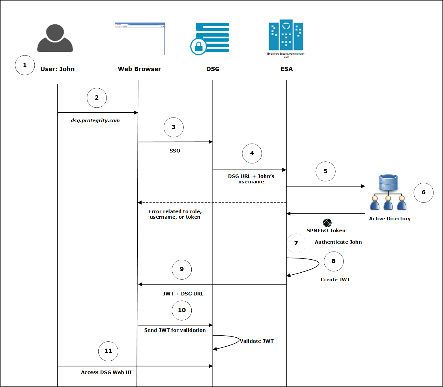 The DSG validates the JWT based on the secret key shared with ESA. On successful validation, John can login to the DSG Web UI.