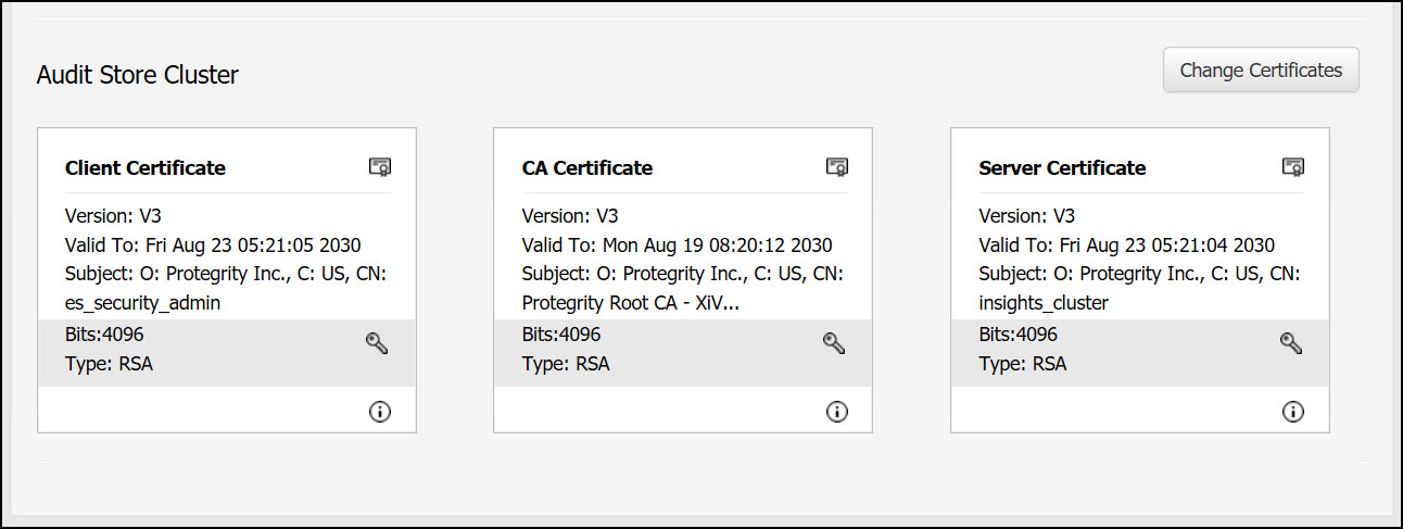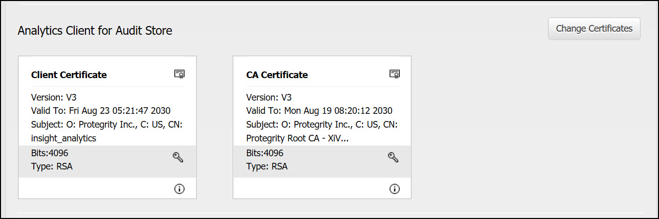The certificates used for Insight are system-generated Protegrity certificates. If required, upload and use custom CA, Server, and Client certificates for Insight.