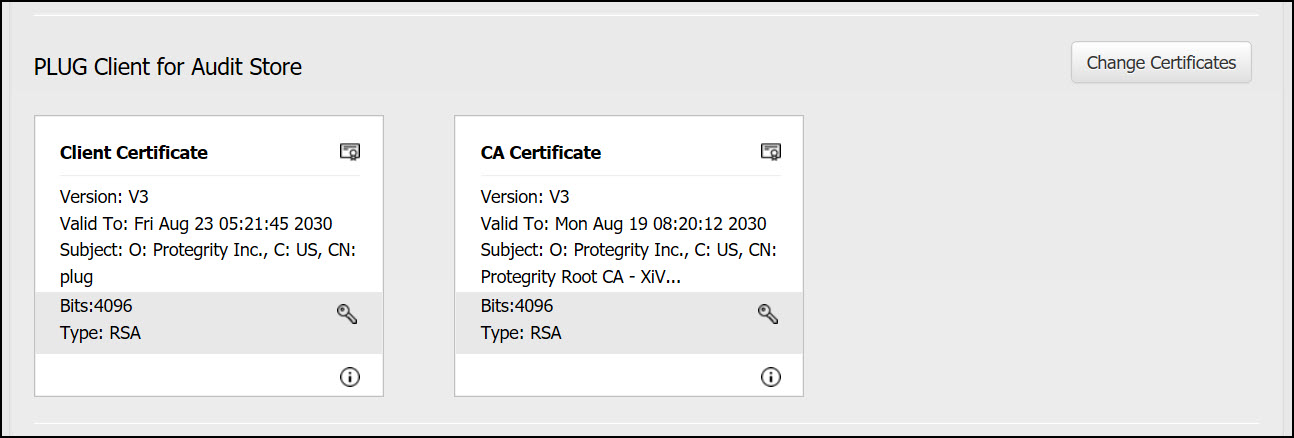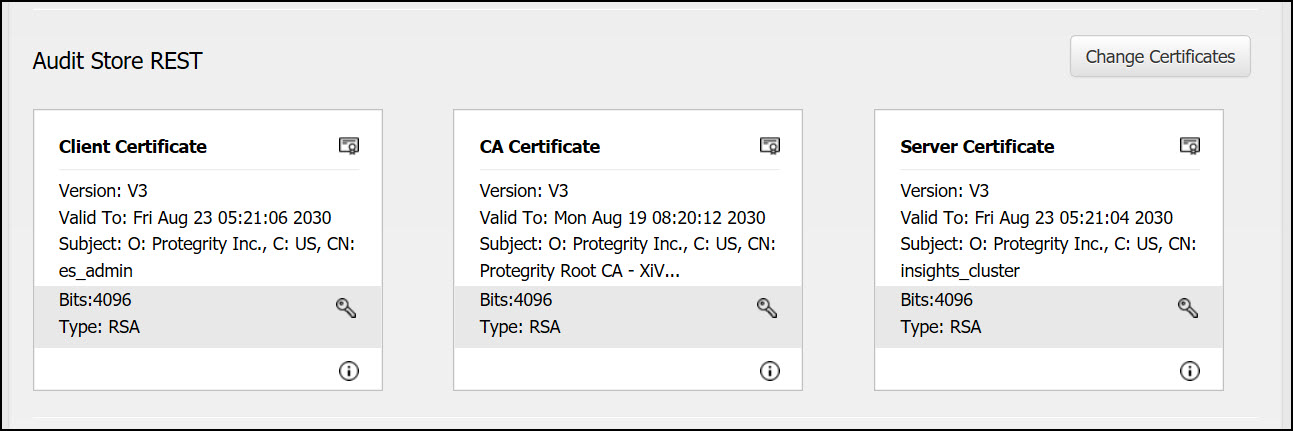 Client certificate:The client certificate is used by the Audit Store nodes to authenticate and communicate with the Audit Store.