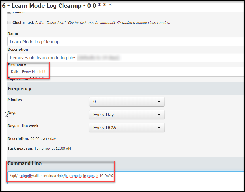 In addition to setting the task, you can define the duration for which you want to archive the Learn Mode logs. The following image displays the Learn Mode Log Cleanup scheduled task.