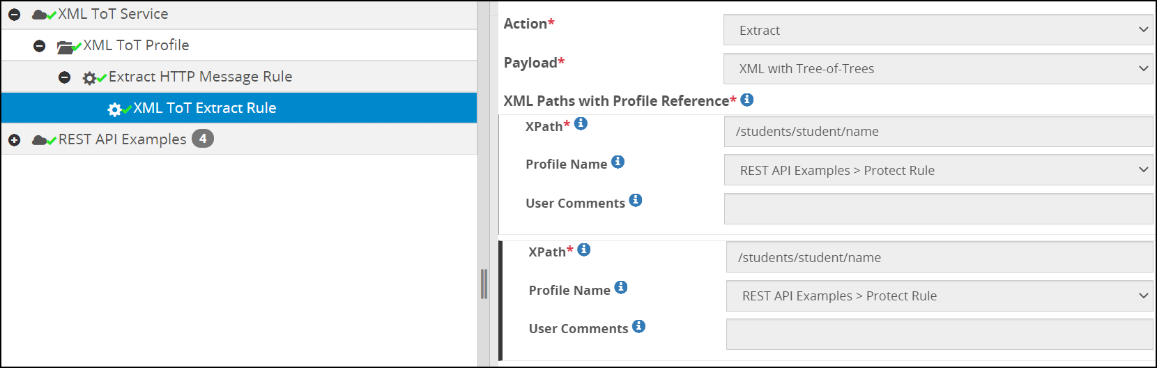 In the above figure, the XML ToT Extract rule extracts the two different XML elements, name and age. The /students/student/name path extracts the name element and protect it with the transform rule. Similarly, the /students/student/age path extracts the age element and protect it with the transform rule. Same data elements are used to protect both the XML elements. You can use different data elements to transform XML elements as per your requirements. It is recommended to use the Profile reference, from the drop-down that appears on the Profile Name field. This helps to process the extraction and transformation in one rule. In addition, it reduces the transform overhead of defining one element at a time for the same XML file. If the Profile Name field is left empty then the extracted value is passed to the child rule for transformation.