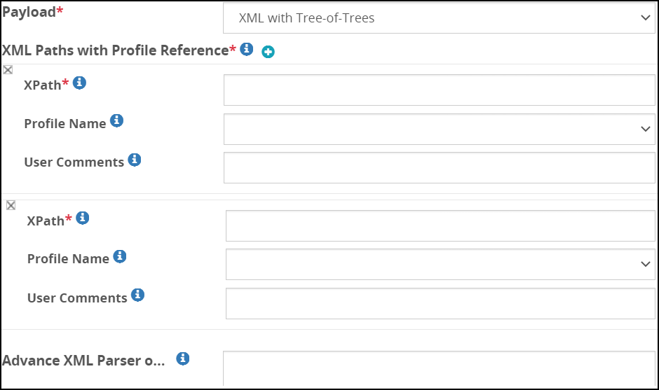 | Advance XML Parser options | Configure advanced parsing parameter options for the XML payload. This field accepts parsing options in the JSON format. The parsing options are of the Boolean data type. For example, the parsing parameter, remove_comments, accepts the values as true or false.Note: The Advance XML Parser options that apply to the XML codec also apply to the XML with ToT codec. For more information about the additional XML Parser, refer to the Table: Advance XML Parser. |