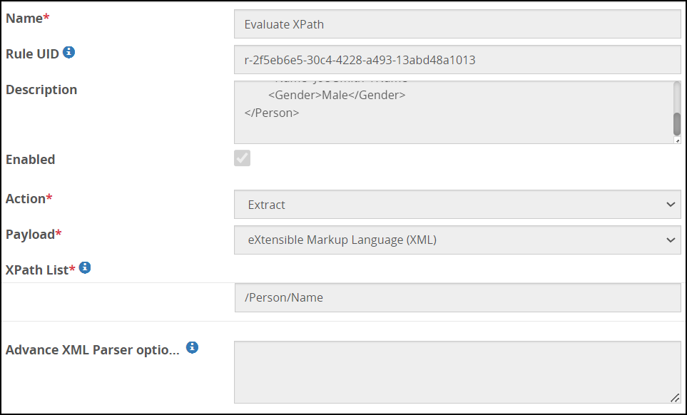 | XPath List | The XML element value to be extracted is specified in this field. Note: Ensure that you enter the XPath by following proper syntax for extracting the XML element value. If you enter incorrect syntax, then the service which has this XML payload definition in the rule fails to load and process the request. |